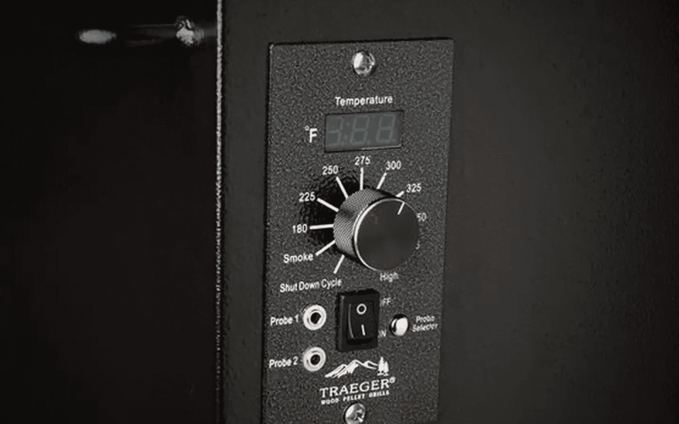Panel sterowania grilla został umieszczony na bocznej ścianie urządzenia. Centralnym elementem jest mechaniczne pokrętło regulacji temperatury z czytelną skalą, obejmującą tryb wędzenia, zakres niskich temperatur oraz wyższe ustawienia przeznaczone do grillowania i pieczenia. Nad pokrętłem znajduje się cyfrowy wyświetlacz, który informuje o aktualnej temperaturze pracy grilla.