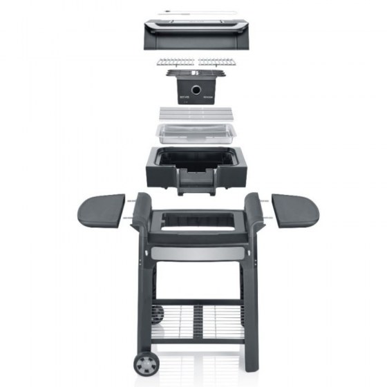 Grille marki SEVERIN są wykonane w taki sposób, że każdy będzie w stanie złożyć go w całość bez najmniejszego problemu. Wykonanie jest bardzo proste i intuicyjne. Czas złożenia takiego grilla to kilka minut od wyciągnięcia z pudełka i odpakowania wszystkich części. Całość składa się z zamykanego piekarnika oraz podstawy na kółkach. Warto dodać, że piekarnik nie jest przytwierdzony do "wózka", a jedynie na nim osadzony, co sprawia, że sam piekarnik można umieścić na kuchennym stole w domu. Piekarnik składa się z misy na olej, aromatyzerów oraz przedniego panelu z wbudowaną grzałką. Rozmontowanie piekarnika na części w celu umycia jest dziecinnie proste!
