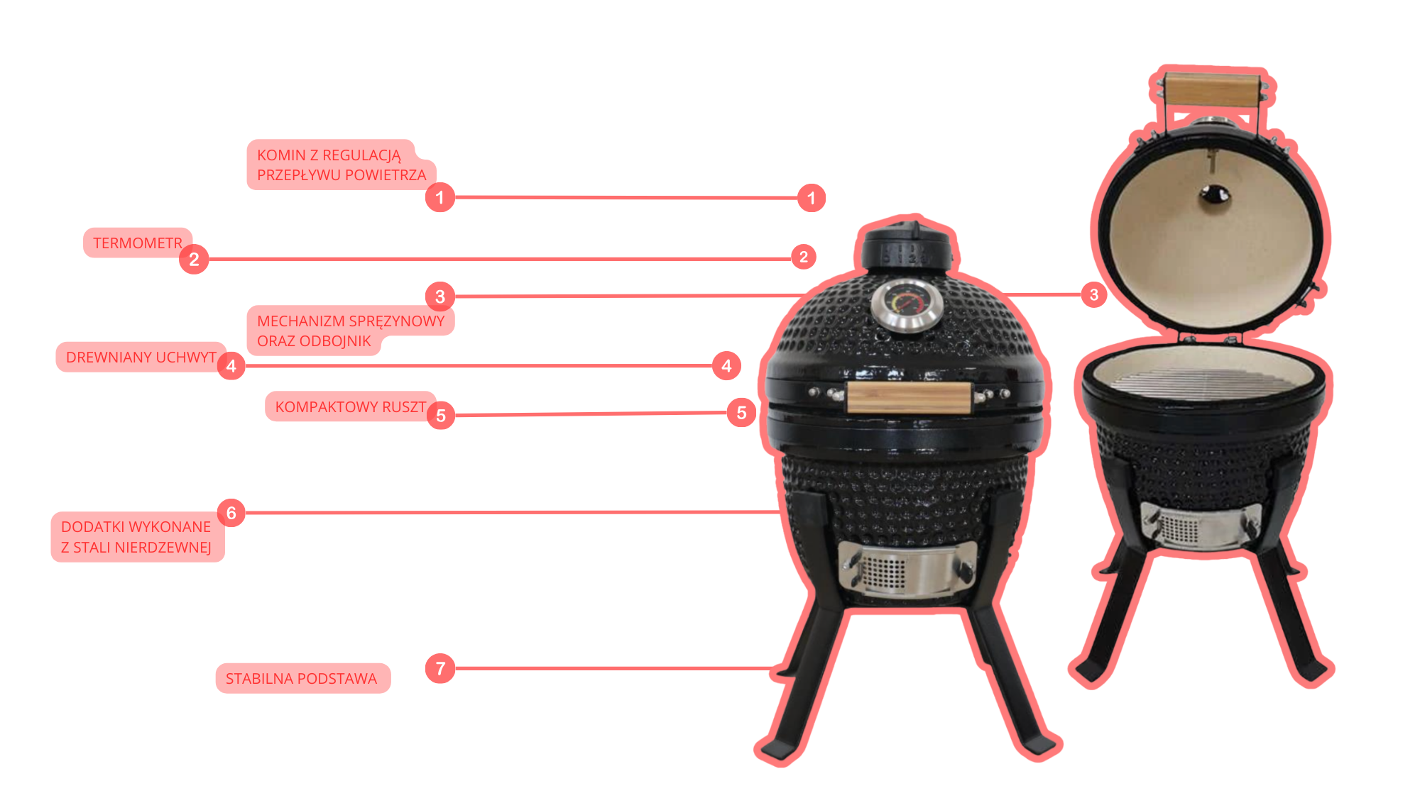 Ceramiczna konstrukcja grilla wyróżnia się wysoką odpornością na pęknięcia oraz skutecznie izoluje ciepło, dzięki czemu obudowa nie nagrzewa się nadmiernie z zewnątrz. W zestawie znajduje się stabilny stojak, żaroodporna uszczelka oraz deflektor ciepła ze stali nierdzewnej, który umożliwia równomierną obróbkę potraw i eksperymentowanie z różnymi technikami grillowania.