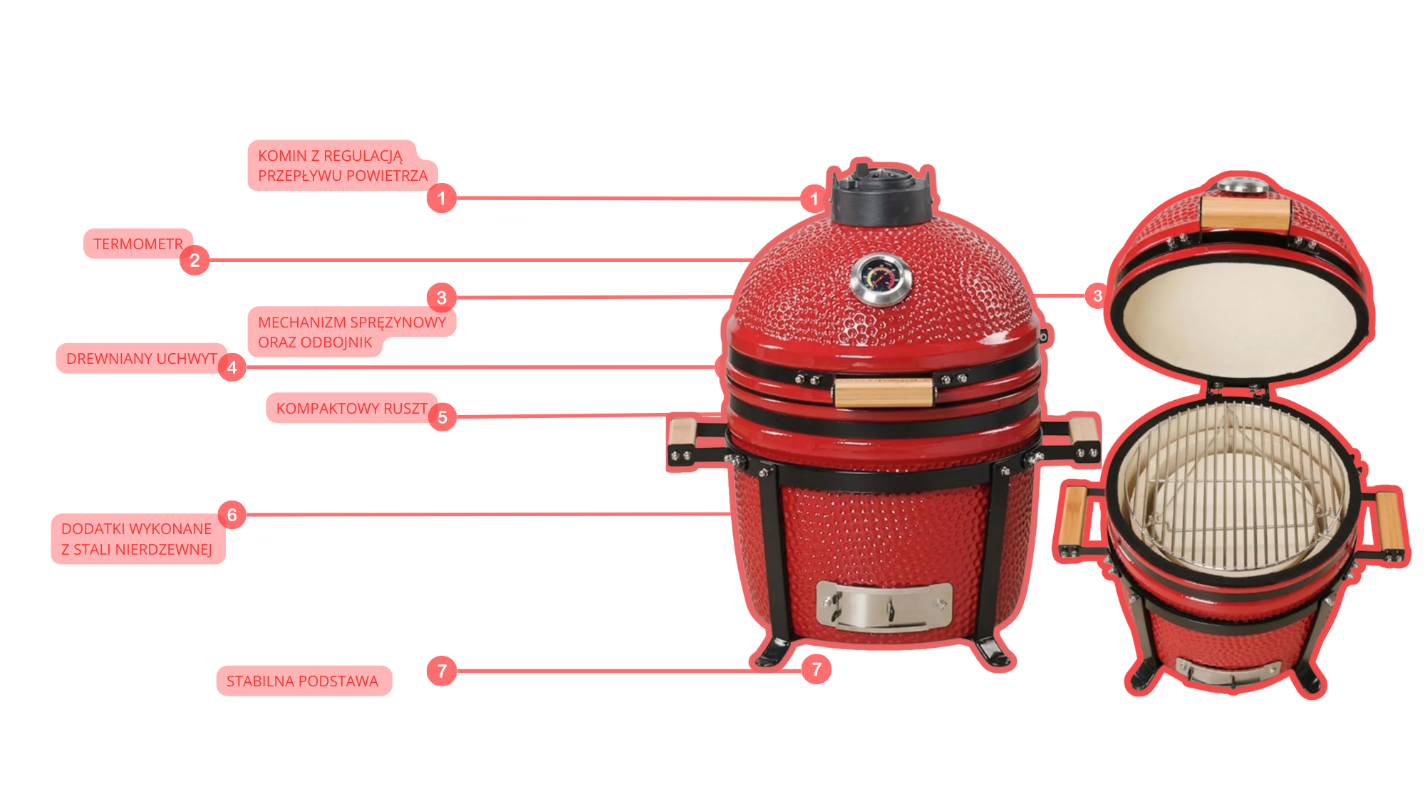 Ceramiczna konstrukcja grilla Kamado Bono MINIMO jest odporna na pęknięcia i nie nagrzewa się nadmiernie z zewnątrz, co zwiększa bezpieczeństwo użytkowania. W zestawie znajdują się praktyczne akcesoria, takie jak stabilny stojak, żaroodporna uszczelka oraz deflektor ciepła ze stali nierdzewnej. Dzięki nim obsługa grilla jest prostsza, a grillowanie staje się czystą przyjemnością.