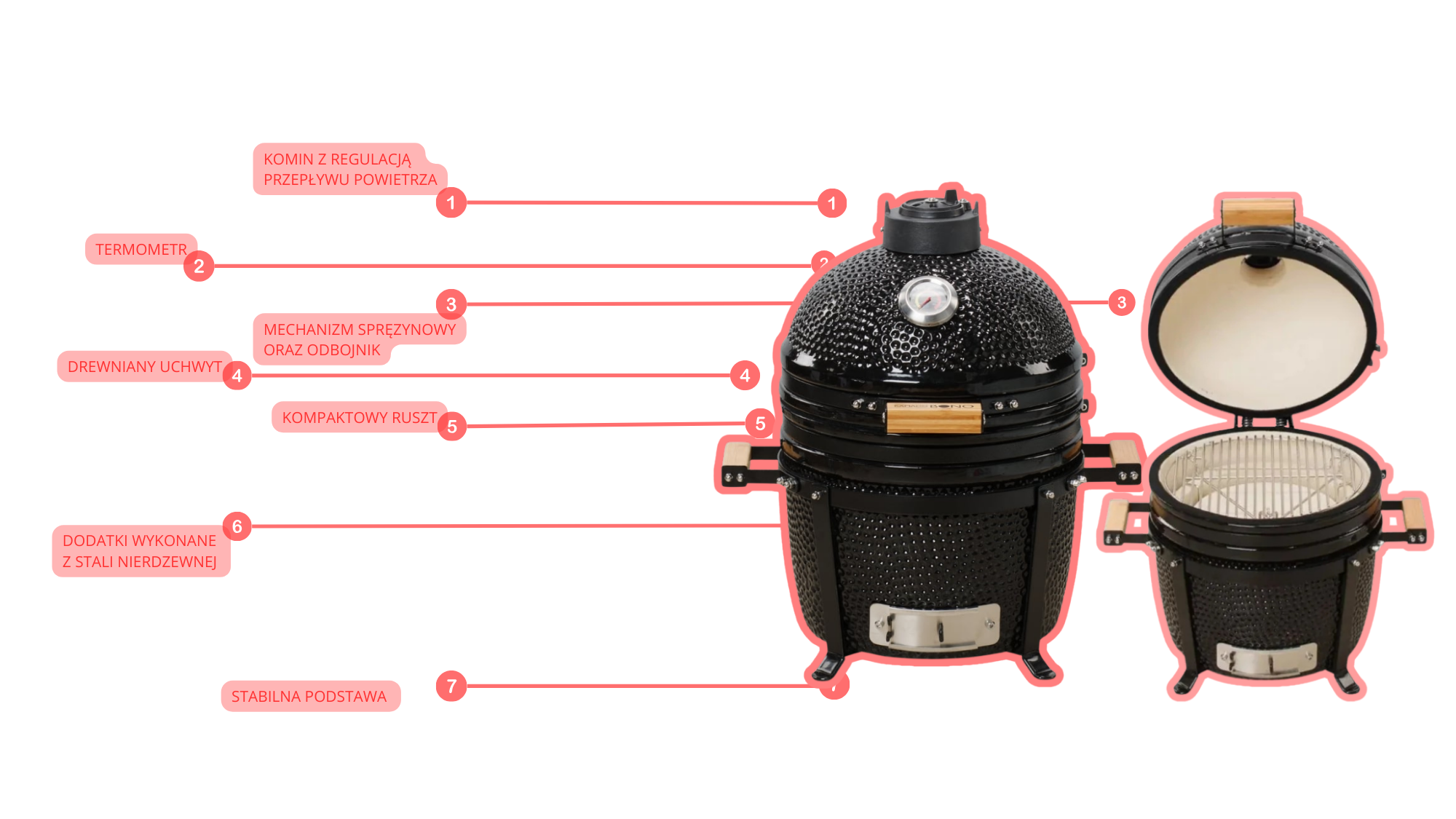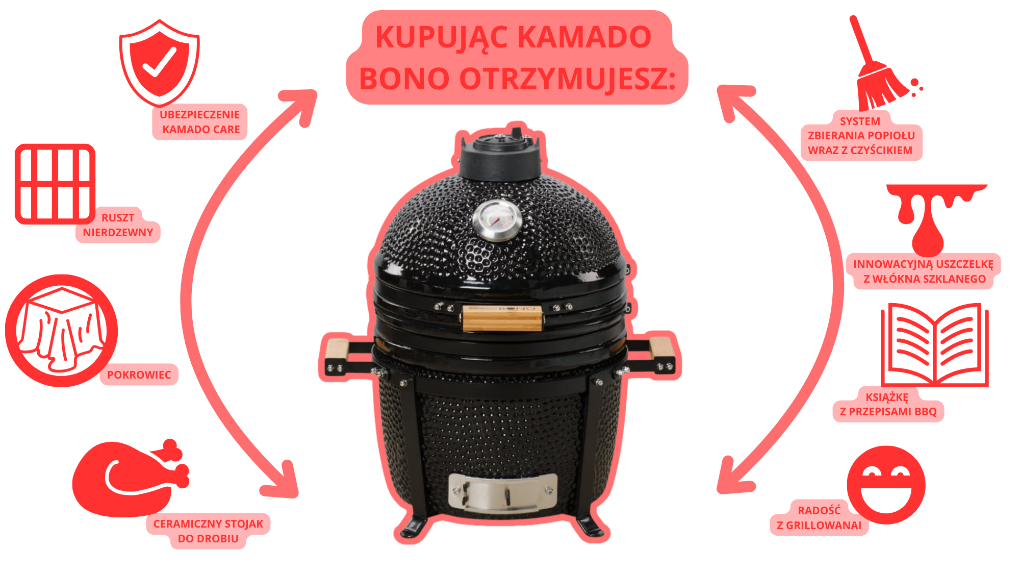 Kamado Bono to sprzęt stworzony na lata. Jest odporny na pęknięcia, bezpieczny w użytkowaniu i wykonany z wysokiej jakości materiałów. Precyzyjna kontrola temperatury oraz przepływu powietrza sprawia, że nawet wymagające potrawy przygotujesz z pełną kontrolą i bez ryzyka przypalenia. To doskonały wybór zarówno dla początkujących, jak i dla pasjonatów grillowania.