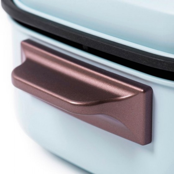 Jest łatwy w utrzymaniu czystości, ponieważ płyty w MultiGrillu Kuvings wykonano z aluminium, by następnie pokryć je powłoką teflonową, przez co smażone potrawy nie przywierają do naczyń, a czyszczenie staje się wyjątkowo proste. Z grillem elektrycznym Kuvings przygotujesz zarówno rodzinne obiady, romantyczną kolację jak i weekendowe przyjęcia. Przeznaczony szczególnie dla osób ceniących sobie wygodę oraz przyjemność gotowania. Ze względu na kompaktowe rozmiary grilla, MultiGrill Kuvings z łatwością zmieści się do samochodu, by zabrać go do rodziny, do znajomych, na działkę, czy jakiś dalszy wyjazd. Z kolei każdą z płyt bez problemu umyjesz w zmywarce.